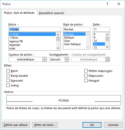 Pour définir des paramètres additionnels, cliquez sur la petite icône affichée en bas et à droite du groupe Police. Cette action déclenche l’affichage de la boîte de dialogue Police. Sous l’onglet Police, style et attributs, vous pouvez choisir un style de soulignement ainsi que divers effets qui sont immédiatement prévisualisés dans la zone Aperçu.
