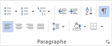 Le groupe Paragraphe, dans l’onglet Accueil du ruban, vous aide à configurer la mise en forme du ou des paragraphes sélectionnés. Vous pouvez définir l’alignement, l’indentation, l’interlignage et la trame de fond du texte, mais aussi choisir un format de puces ou une numérotation.