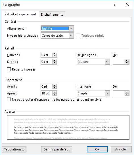 Pour accéder à des paramètres complémentaires, cliquez sur la petite icône affichée dans la partie inférieure droite du groupe Paragraphe. La boîte de dialogue Paragraphe s’affiche, onglet Retrait et espacement sélectionné :