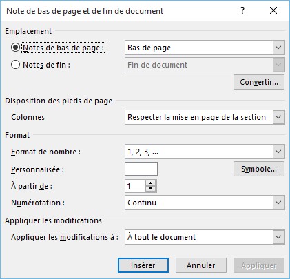 Vous pouvez personnaliser la manière dont les notes apparaissent dans un document. Cliquez sur le lanceur de boîte de dialogue Notes de bas de page. Sous Emplacement, définissez l’endroit où les notes doivent être affichées. Sous Format, choisissez le format de la numérotation ou le symbole à utiliser.