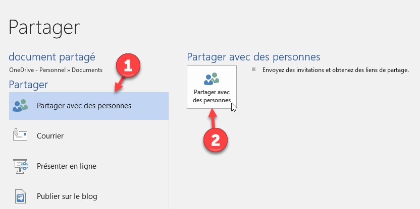 Pour faire savoir à vos collègues qu’un nouveau document est disponible, cliquez sur Fichier puis sur Partager. Vous pouvez inviter des personnes à visualiser et/ou à modifier votre document. Vérifier que l’onglet Partager avec des personnes (1) est sélectionné sous Partager, puis cliquez sur Partager avec des personnes (2).