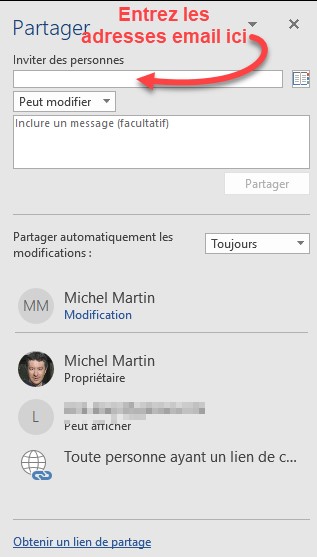 Entrez les adresses e-mail de chaque personne, séparées par des points-virgules. Indiquez si ces personnes peuvent modifier ou simplement visualiser votre document. Si nécessaire, ajoutez un message personnel à l’invitation, puis cliquez sur Partager. Vos collègues recevront un e-mail les invitant à accéder à votre document.