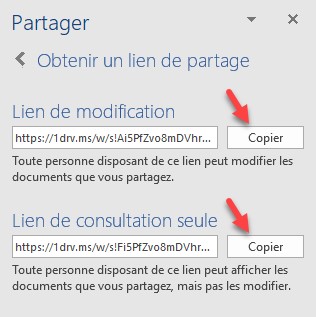 Vous pouvez également obtenir un lien de partage permettant d’afficher ou de modifier votre document. Cliquez sur Obtenir un lien de partage, dans la partie inférieure du volet Partager. Cliquez sur le bouton Copier sous Lien de modification, ou sous Lien de consultation seule, selon le type de lien que vous souhaitez créer. Ces liens peuvent être partagés par tous les moyens à votre disposition : e-mail, intranet, etc.