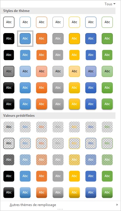 - Cliquez sur l’icône Plus dans le groupe Styles de formes pour appliquer un style prédéfini à la forme. Pointez un style pour prévisualiser son effet dans le document. Cliquez pour l’affecter à la forme. Si nécessaire, vous pouvez modifier la couleur de remplissage et le contour de la forme en utilisant les icônes Remplissage et Contour, dans le groupe Styles de formes.