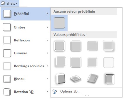 - L’icône Effets donne accès à divers réglages permettant de modifier l’ombrage, la réflexion, la lumière, etc. Ici encore, il vous suffit de pointer un effet pour le prévisualiser dans le document et de cliquer pour l’appliquer à la forme.