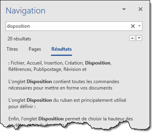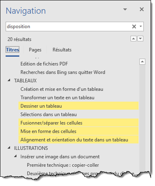 Entrez un mot dans la zone de recherche. L’onglet Titres du volet de navigation met en surbrillance les seuls niveaux de titres dans lesquels ce mot est trouvé.