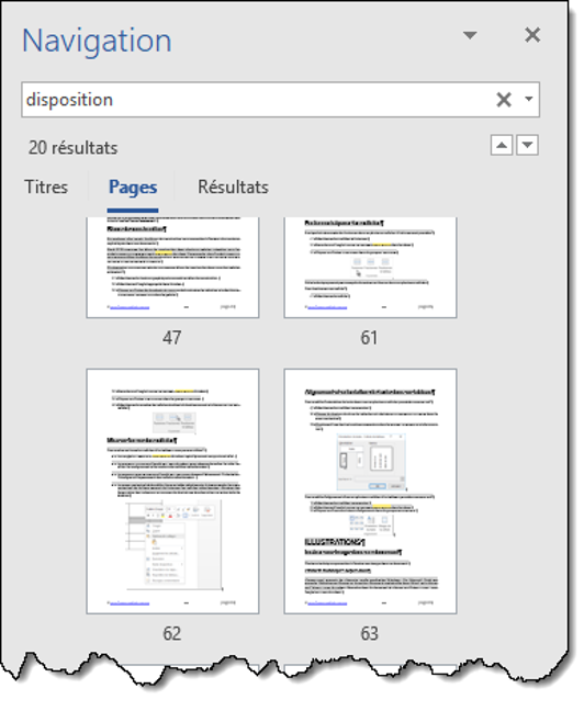 Pour activer le volet de navigation, sélectionnez l’onglet Affichage dans le ruban et cochez la case Volet de navigation dans le groupe Afficher. Le document peut être parcouru par ses niveaux de titre ou par page.