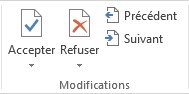 - Cliquez sur Accepter et passer à la suivante ou sur Refuser et passer à la suivante dans le groupe Modifications pour accepter ou refuser la modification en surbrillance er passer à la modification suivante.