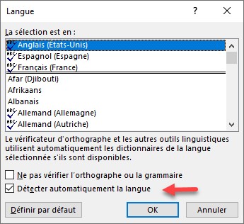 Si vous écrivez un document dans une langue étrangère que Word n’arrive pas à identifier après quelques mots, basculez sur l’onglet Révision du ruban. Dans le groupe Langue, cliquez sur Langue, puis sur Définir la langue de vérification. La boîte de dialogue Langue s’affiche. Cochez la case Détecter automatiquement la langue et validez en cliquant sur OK :