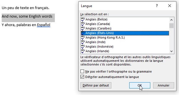Plusieurs langues peuvent être utilisées dans un même document. Pour indiquer qu’un bloc de texte est écrit dans une langue spécifique, sélectionnez ce bloc puis basculez sur l’onglet Révision dans le ruban. Dans le groupe Langue, cliquez sur Langue puis sur Définir la langue de vérification et désignez la langue dans laquelle le bloc de texte est écrit.